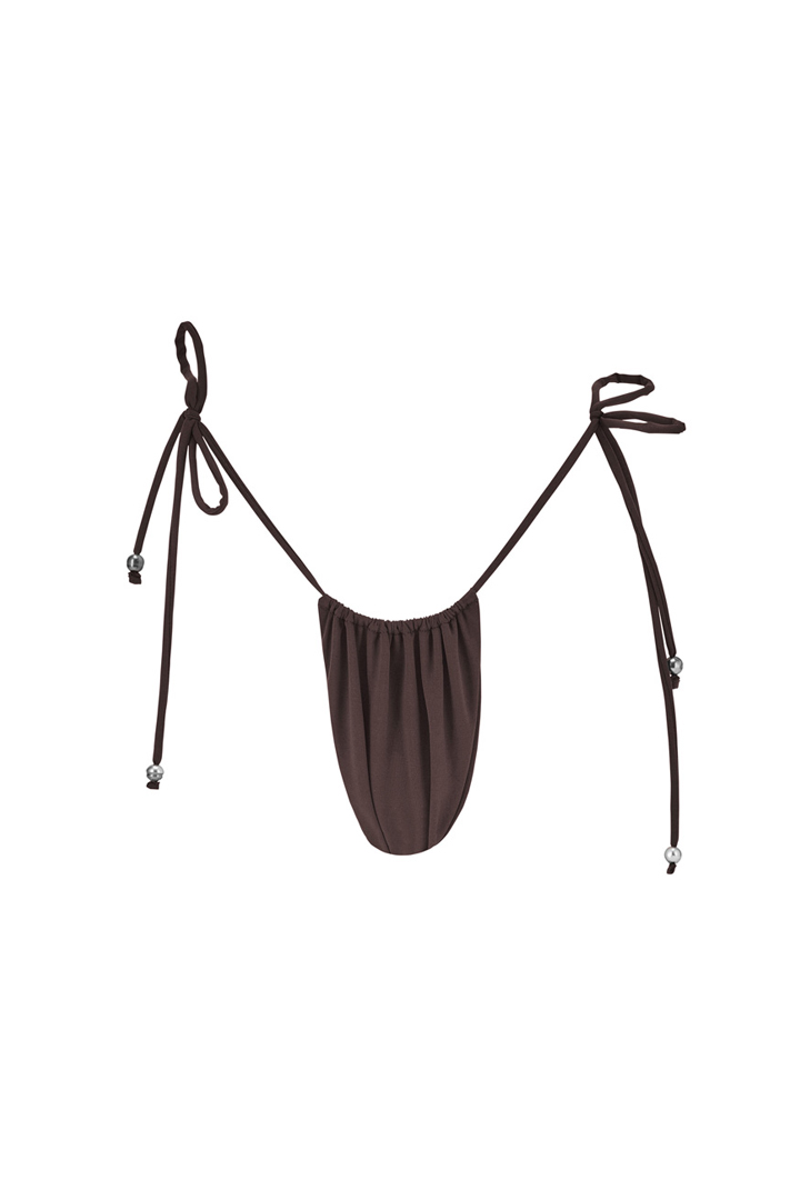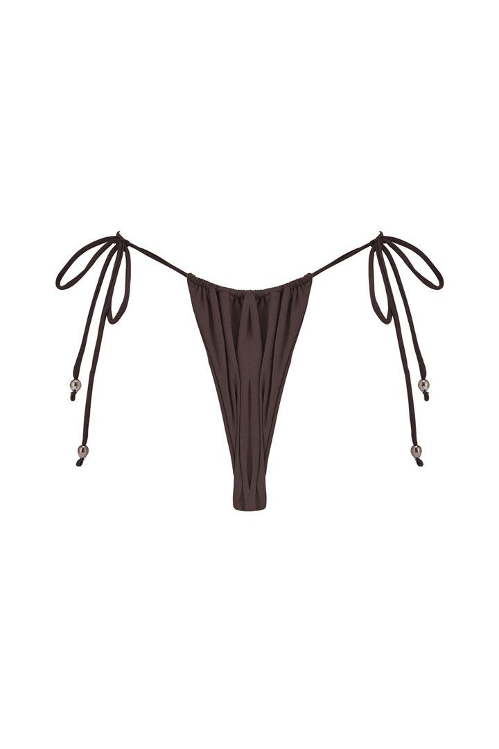 The Maimiti bottom in Espresso is equally elegant, with Tahitian pearls on each tie end. Fully adjustable, it offers a tailored fit to enhance curves with sensuality. Its Espresso shade adds sophistication and boldness. For an even more alluring effect, opt for a smaller size.