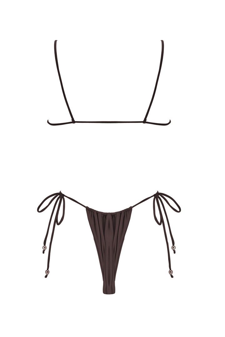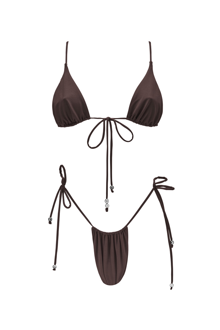 The MAIMITI set in Espresso color embodies timeless elegance and natural charm. The top, tied at the front, is enhanced with three Tahitian pearls. The equally refined bottom is adorned with Tahitian pearls at the ends of its adjustable ties. Thanks to its fully adjustable cords, this set suits all body types, offering a tailored fit and customizable coverage. For a bolder look, opt for a size down.