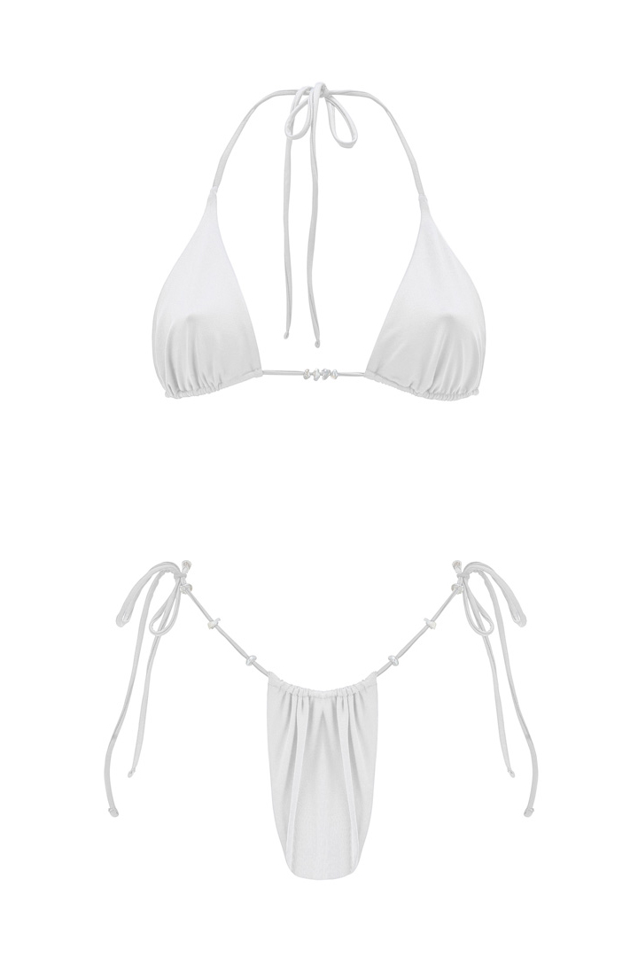 Centerpiece of the SEANAY collection, the VAIHAU set in Crystal color embodies elegance and sensuality. Its adjustable triangle top is adorned with four Keshis, while the bottom, featuring six Keshis, allows for perfect customization. The Keshis can be arranged as desired, creating a unique and refined swimsuit. With fully adjustable straps, this set suits all body types, offering a tailored fit and adjustable coverage. For a bolder look, choose a size down.