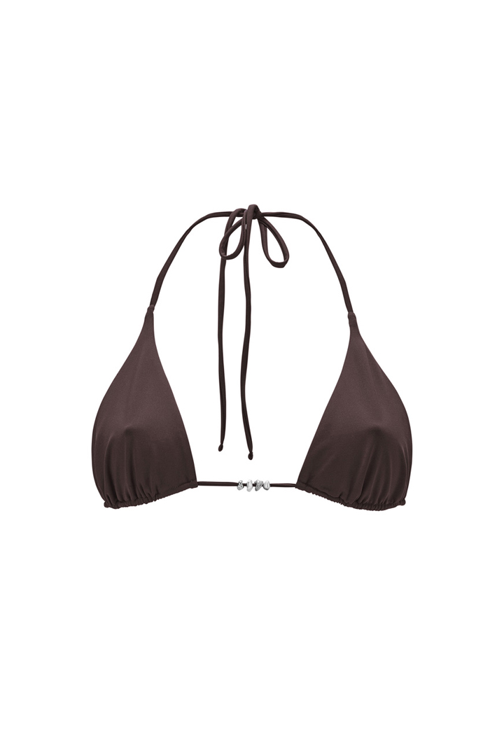 In an alluring Espresso color, this adjustable triangle top embodies the elegance of deep coffee hues. The four Keshis add a touch of originality and luxury, while the adjustable cords ensure a tailored fit for every body type. This sophisticated model, with its warm and mysterious tones, subtly and classily enhances the neckline.