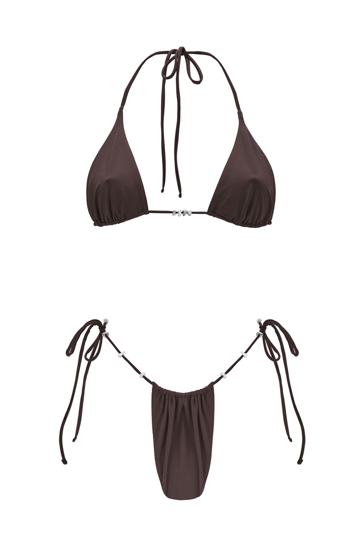 Centerpiece of the SEANAY collection, the VAIHAU set in Espresso color, reminiscent of the rich, captivating hues of coffee, embodies refinement and boldness. Its adjustable triangle top is adorned with four Keshis, while the bottom, featuring ten Keshis, allows for perfect customization. The Keshis can be arranged as desired, creating a unique and refined swimsuit. With fully adjustable straps, this set suits all body types, offering a tailored fit and adjustable coverage. For a bolder look, choose a size down.