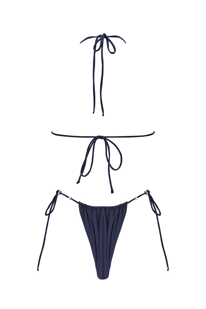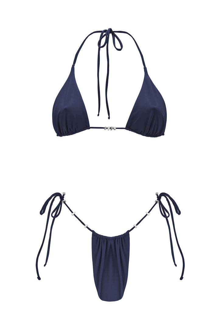 Centerpiece of the SEANAY collection, the VAIHAU set in Navy color, inspired by the depths of the Pacific Ocean, embodies elegance and sensuality. Its adjustable triangle top is adorned with four Keshis, while the bottom, featuring ten Keshis, allows for perfect customization. The Keshis can be arranged as desired, creating a unique and refined swimsuit. With fully adjustable straps, this set suits all body types, offering a tailored fit and adjustable coverage. For a bolder look, choose a size down.