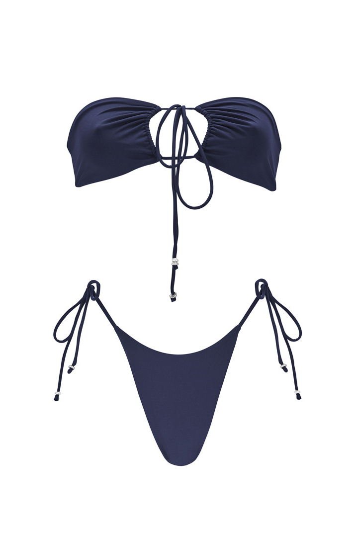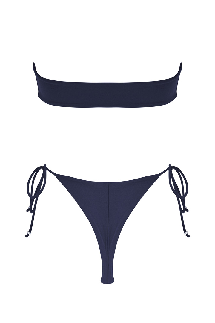 The VAIPOE set in Navy color, inspired by the captivating depth of the Pacific abyss, combines timeless elegance and natural charm. A true innovation in the SEANAY collection, it stands out with its sophisticated bandeau top and high-cut thong bottom.