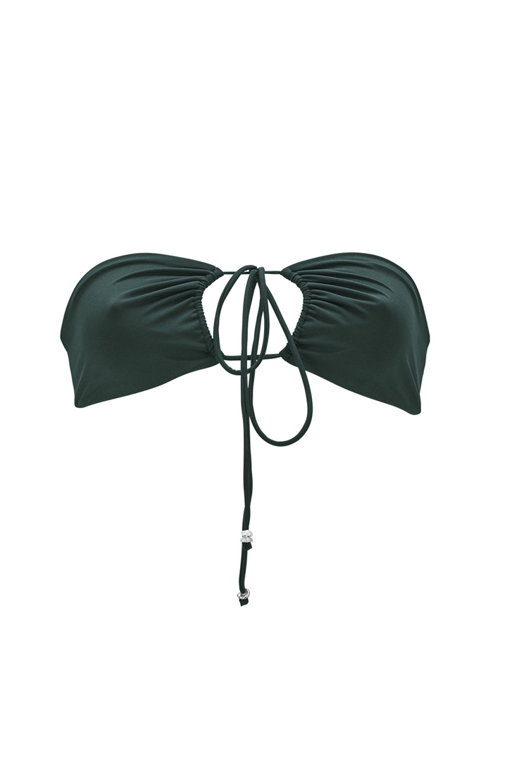 This sophisticated bandeau top in Palm color is an invitation to escape. Inspired by the lush vegetation of Polynesia, it combines comfort and elegance with its three delicately placed Keshis. Designed to be tied around the neck, it offers personalized support and adaptability while enhancing the neckline. Ideal for women seeking a natural yet chic style, this top merges sophistication and simplicity in a tropical green hue.
