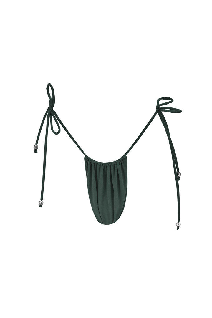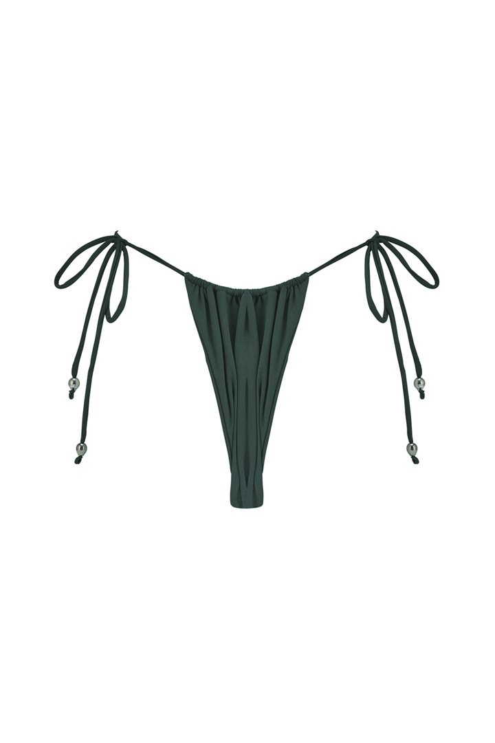 Le bas Maimiti Palm, agrémenté de perles de Tahiti aux cordons, incarne l’élégance tropicale. Grâce à ses cordons ajustables, il permet de personnaliser l’échancrure et le maintien, mettant en valeur les courbes avec finesse. Sa teinte verte est parfaite pour un look inspiré de la nature. Pour un effet plus osé, optez pour une taille en dessous.