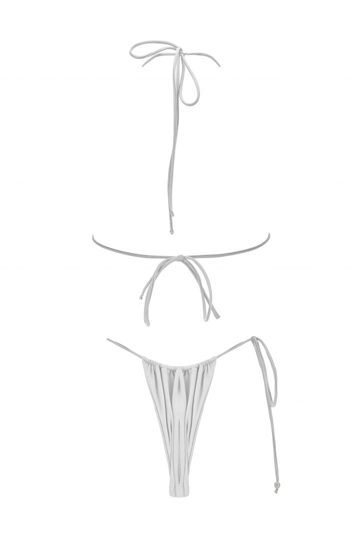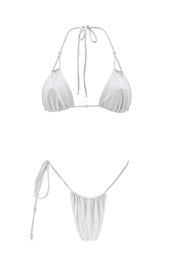 L’ensemble POEHERE en coloris Crystal, évoquant la clarté et la pureté des eaux cristallines, allie raffinement et sensualité. Son haut triangle à goutte, délicatement orné de trois perles de Tahiti, tandis que le bas, noué sur une seule hanche, crée une silhouette sensuelle et unique. Chaque cordon est sublimé par une perle de Tahiti.