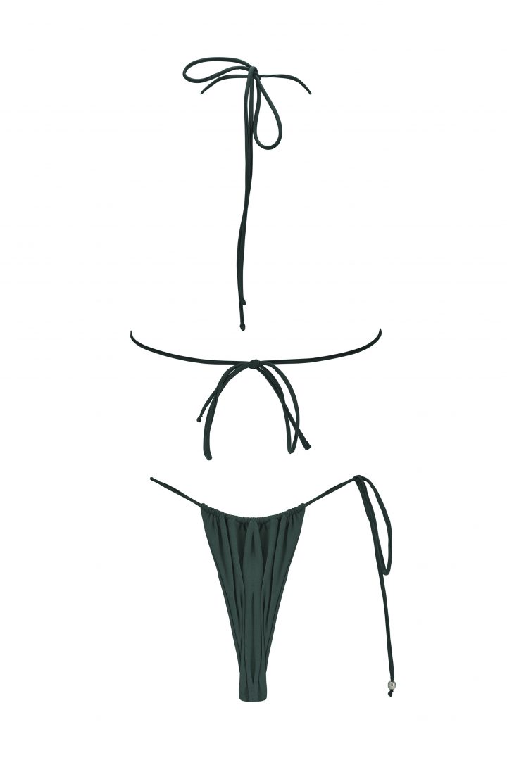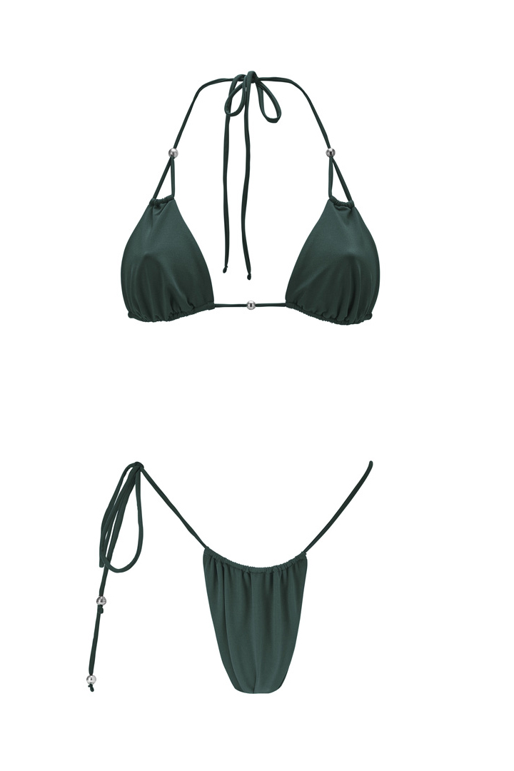L’ensemble POEHERE en coloris Palm, inspiré par la verdure luxuriante de la flore polynésienne, incarne l’élégance et la sensualité. Son haut triangle à goutte, délicatement orné de trois perles de Tahiti, tandis que le bas, noué élégamment sur une seule hanche, crée une silhouette sensuelle et unique. Chaque cordon est sublimé par une perle de Tahiti.